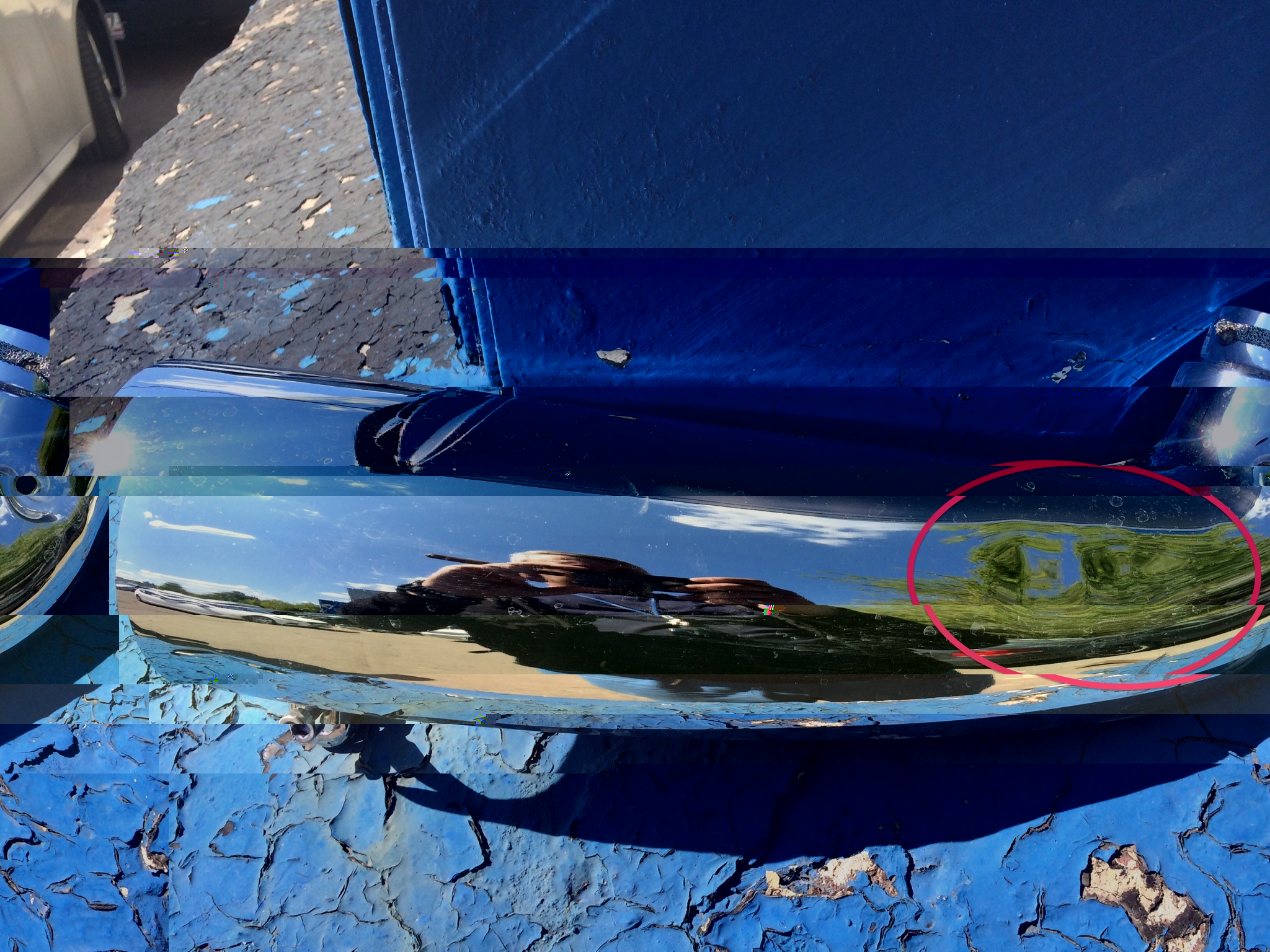 Прямоточный выхлоп имеет дефект на правой трубе, фото ниже, стоковый выхлоп без повреждений. Так же есть передние дуги и так же правая с небольшим повреждением.