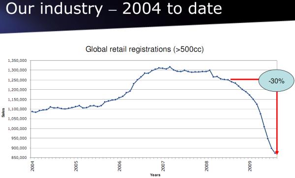 Общий график продаж мотоциклетной индустрии по всем странам. Общее падение на -30% к концу 2009 года: